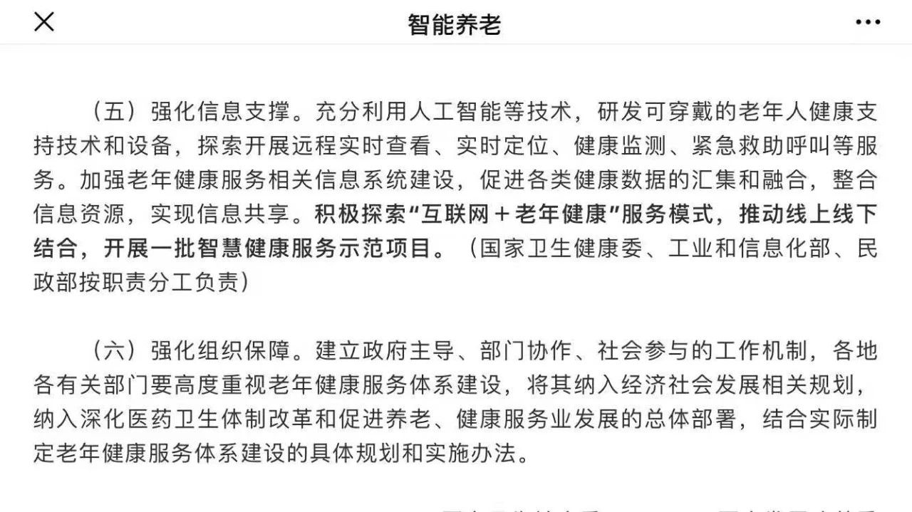在此意見里按照老年人健康特點和老年人健康服務需求,向各部門提到了各自的工作任務和目標,并督促相關(guān)部門抓緊制定完善老年健康相關(guān)制度、標準、規(guī)范,為各項老年健康服務提供遵循。